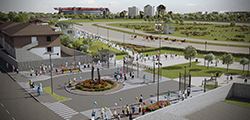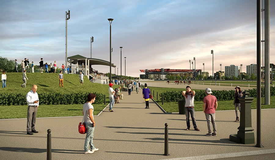 2. L’ingresso, in un contestualizzato stile impero, da accesso a tutta l’area di progetto da via E. Montale, si propone come una grande piazza (circa 1350 mq) accessibile da tutti. L’ingresso è caratterizzato un impianto a raggiera, con due aiuloe localizzate, che si sviluppa dall'aiuola circolare posta al centro dell'area di ingresso; questo impianto prende il posto delle due generiche aiuole a verde. All'interno dell'aiuola centrale (in progetto, caratterizzata da una fontana) rimane interposto un ferro di cavallo che si manterrà al di sotto della quota finita della recinzione di ingresso, la funzione iconografica di tale scultura vuole contestualizzare il luogo. Le pareti laterali che contengono l’ingresso scandiscono ritmicamente l’avvicinarsi del passaggio dentro/fuori attraverso la verticalità regolare data dal cemento cannellato. A dividere lo spazio pubblico dal privato è prevista una cancellata molto fine che fornirà il solo limite fisico di separazione e lascerà libera la visione sull’area dell’ippodromo. Nella cancellata si aprono due accessi carrabili e due pedonali da cui si accederà al parcheggio.
